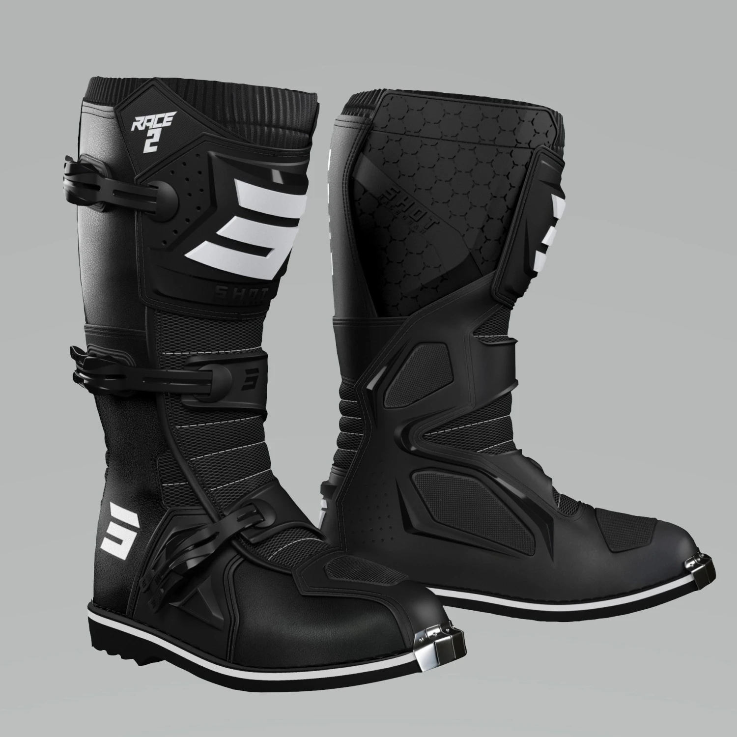 De SHOT Race 2 Crosslaars is onderdeel van de ChromeBurner motorcrosscollectie. Motorcross- en endurorijders hebben hun eigen speciale wensenlijstje voor waar hun uitrusting aan moet voldoen. Of je nu professioneel crosst en grote sprongen maakt of slechts recreatief offroad rijdt, een ongelukje ligt nu eenmaal altijd op de loer en blessures komen veel voor. Een paar sterke offroadlaarzen maakt de kans op blessures kleiner door de impact te absorberen en te voorkomen dat je voet in ongewenste richtingen kan draaien. Mocht deze specifieke laars toch niet jouw ding zijn, bekijk dan al onze andere crosslaarzen van SHOT.
